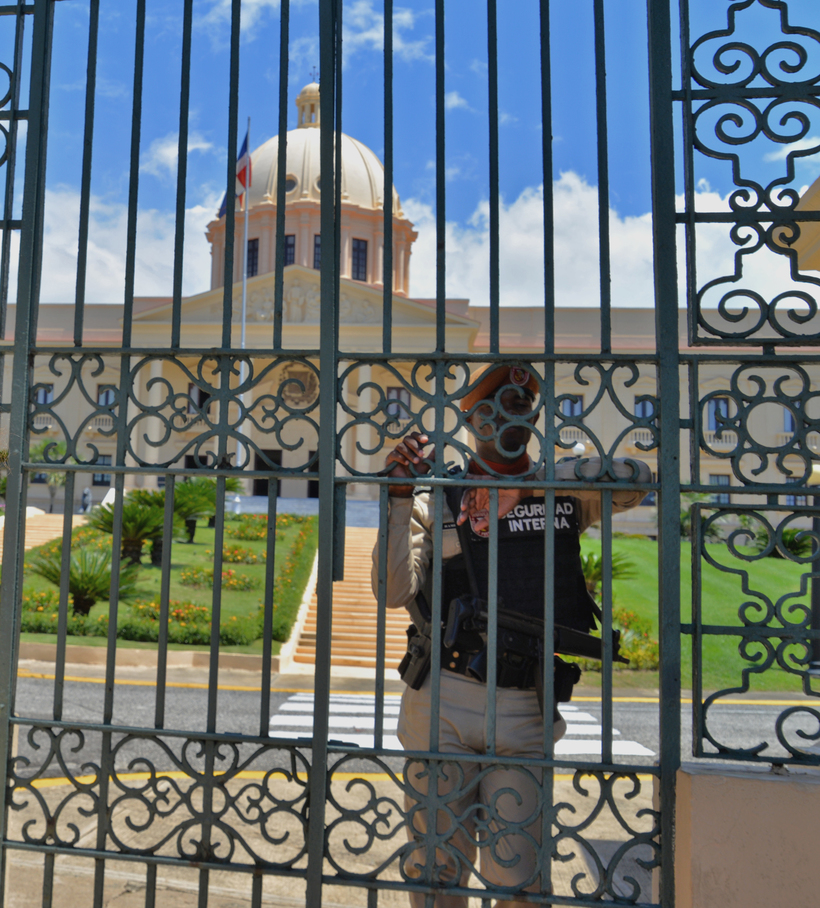 Здесь располагается официальная резиденция глав правительства Доминиканской Республики. Так что не удивительно, что территория строго охраняется вооруженными военными по всему периметру. Но, к счастью, они вовсе не агрессивны, не запрещают делать снимки, на любопытство туристов реагируют спокойно. Один из этих ребят даже вышел к нашей экскурсионной группе и по собственной инициативе сфотографировался с желающими.