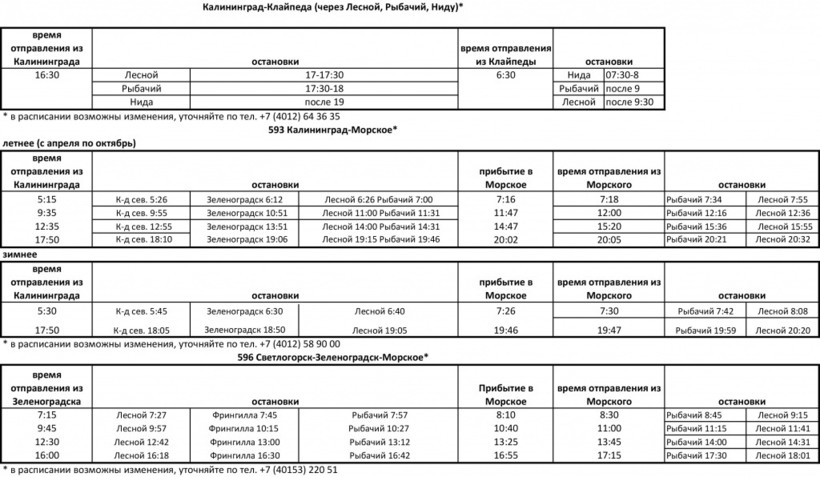 Добраться до Калининградской области можно, прилетев в аэропорт Калининграда, или добраться по железной дороге, есть еще вариант паромной переправы, а затем доехать до косы. Как вариант, можно приехать в Зеленоградск на электричке либо автобусе из Калининграда, прогуляться по городу, а затем оттуда приехать в один из ближайших поселков – Лесной или Рыбачий (там очень близко, не больше 30 минут езды), которые находятся уже непосредственно на территории Куршской косы. Можно не останавливаться в Зеленоградске и направиться сразу на косу, конечным пунктом будут те же поселки. Другие варианты и расписание автобусов можно посмотреть ниже.