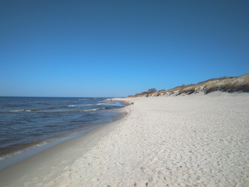 Мы вышли на остановке Высота Эфа. Около остановки есть хорошее кафе, где жарят вкусный шашлык. В апреле ещё не сезон и не везде можно поесть. Потом прошли пешком по берегу моря до Морского, побродили по берегу Куршского залива, посмотрели местные турбазы. Берег, к сожалению, загажен рыбаками(. На море в это время ветер ледяной, а на заливе - тихо и жарко. Знакомые сказали, что со стороны Литвы коса совсем другая. Теперь очень хотим приехать ещё раз и посмотреть все).