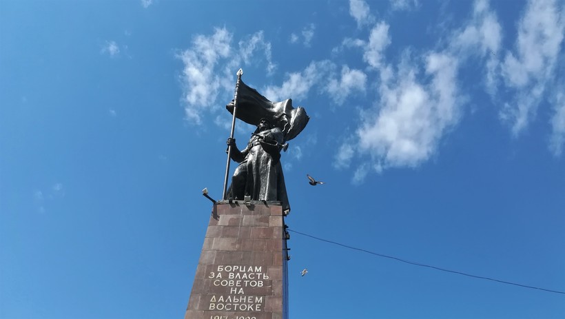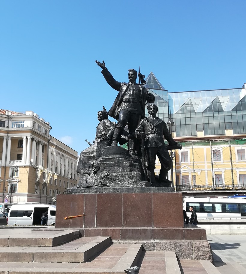 Площадь выглядит скорее не нарядно, а революционно и потому - величественно (не зря же она раньше называлась площадью борцам за власть Советов). Такое настроение создается, в первую очередь, огромными бронзовыми скульптурами. Одна из них представляет собой памятник борцам за власть Советов на Дальнем Востоке. Памятник представляет собой тридцатиметровый постамент, на котором находится фигура бойца, держащего в руках разевающееся знамя и трубу. В дизайне памятника нет ничего лишнего – он выглядит очень строго, я бы даже сказала «угловато». Рядом с памятником находятся две скульптуры, состоящие из нескольких фигур. Они также продолжают тему героического прошлого Владивостока. Так, слева от памятника борцам за власть Советов находится скульптура трех человек: матроса, солдата и рабочего, у ног которых лежит перевернутый двуглавый орел. Таким образом, скульпторы изобразили свержение самодержавной власти, состоявшееся в 1917 году.