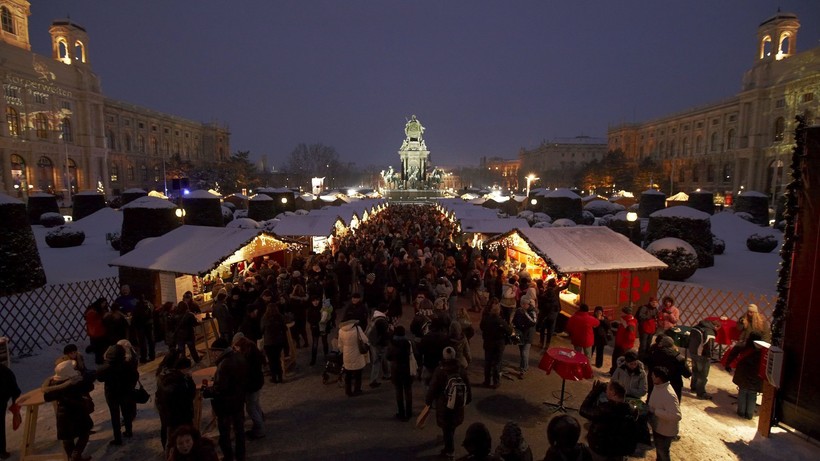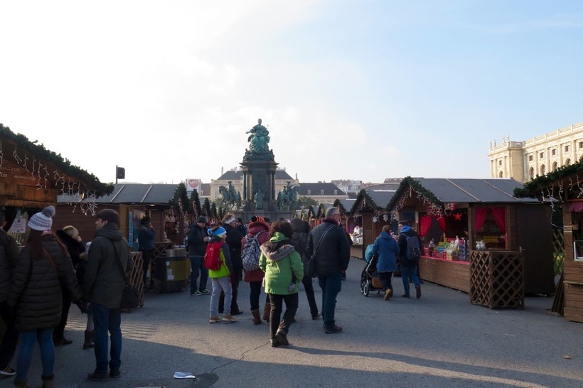 Как-то мы гуляли в ноябре там большой компанией, больше десяти человек, и прям зависли около памятника на этом рыночке, потому что всем хотелось выпить горячего глинтвейна или апельсинового пунша, съесть по сосиске и закусить вафелькой. Поэтому, когда вы приезжаете в Вену перед Рождеством и рынки ещё не закрылись, сюда следует заглянуть однозначно. Это не самый выдающийся рождественский рынок Вены, но он очень-очень милый.