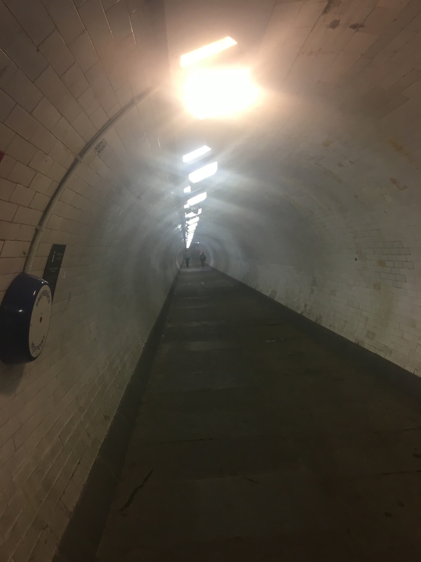 Почти сразу попав в туннель, я поняла, что точно не пойду по нему на другой берег. Я наверное перепутала этот туннель с другим местом. Потому что, представляла его совсем другим. В моем воображении он был широким и комфортным, со стенами в графите и со стеклянным потолком, через который видна река. Но, это увы было совсем по-другому, и понятно, что когда читаешь множество информации перед поездкой что-то напутать неудивительно.