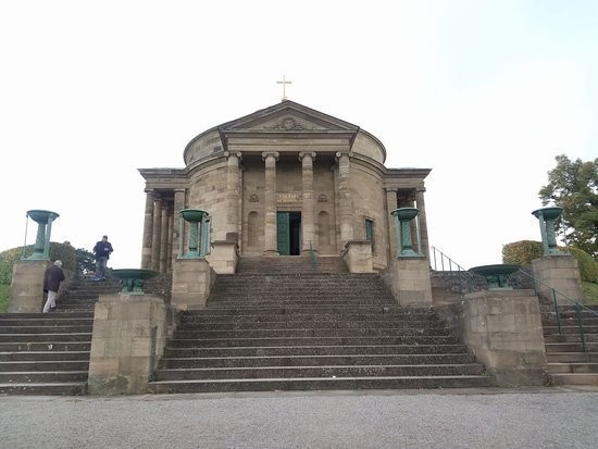 К этому месту нас отвёз муж моей сестры, к которым я приехала осенью прошлого года, с фразой "Знаю я тут одно хорошее место". И место, действительно, было хорошим, даже замечательным. Мы взяли машину-кабриолет в прокат и на всём пути к этому месту нам открывались прекрасные виды. Мы оставили машину в самом начале горы Вюртемберг и начали по ней подниматься. И чем выше поднимались, тем открывался всё более захватывающий пейзаж. Мы проходили вдоль видов множества виноградников, нам открывался вид на весь Штутгарт, на телебашню, на завод Мерседес, на площади и улицы, и это было очень красиво. Так долго, останавливаясь на каждом красивом виде, мы поднимались к погребальной часовне.Она была построена по приказу императора Вильгельма Первого в память об умершей жене Катерине Павловне. Внутрь (не помню по каким причинам) нам не удалось войти, но внешний вид уже очень завораживает, особенно создаёт впечатление надпись над входом в склеп, которая переводится как "Любовь не умрёт никогда". Далее мы обошли эту часовню и прогулялись по тропинкам сада наверху этой горы, с которой как раз и открываются самые восхитительные виды.