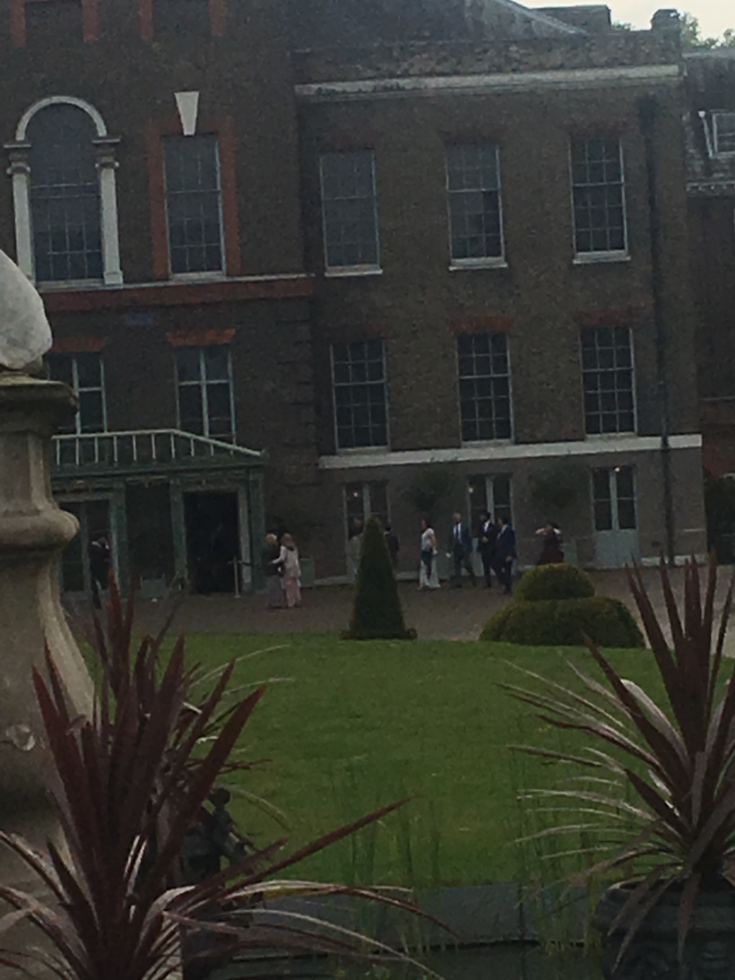 В последний вечер моего прибывания в Лондоне я пошла прогуляться к Кенсингтонскому дворцу. Вход внутрь был уже закрыт, он закрывается в пять часов. И обычно можно гулять вокруг входа гораздо позже. Но тут стояли заграждения до самого памятника и я увидела, что во дворец собираются гости на какой-то приём. Дамы в вечерних платьях и джентельменам в костюмах заходили в знакомый вход.