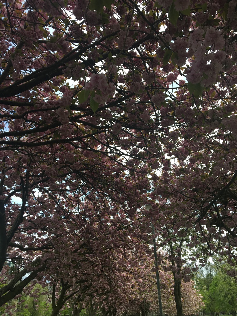Как же это было красиво. Парк огромный, но спланирован не стандартно. Аллеи с цветущими деревьями высажены треугольниками на огромной территории с зелёными лужайками. Везде стоят лавочки и очень много людей гуляло по парку. На лужайках бегали и дети и собаки. Группа студентов занималась зарядкой. На лавочках сидели пенсионеры. Было так солнечном приятно. Настроение мое и без того неплохое, улучшалось с каждой минутой. Я зашла в первую аллею и почувствовала необыкновенный аромат.