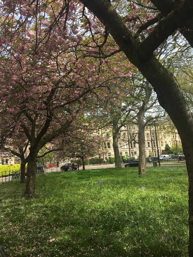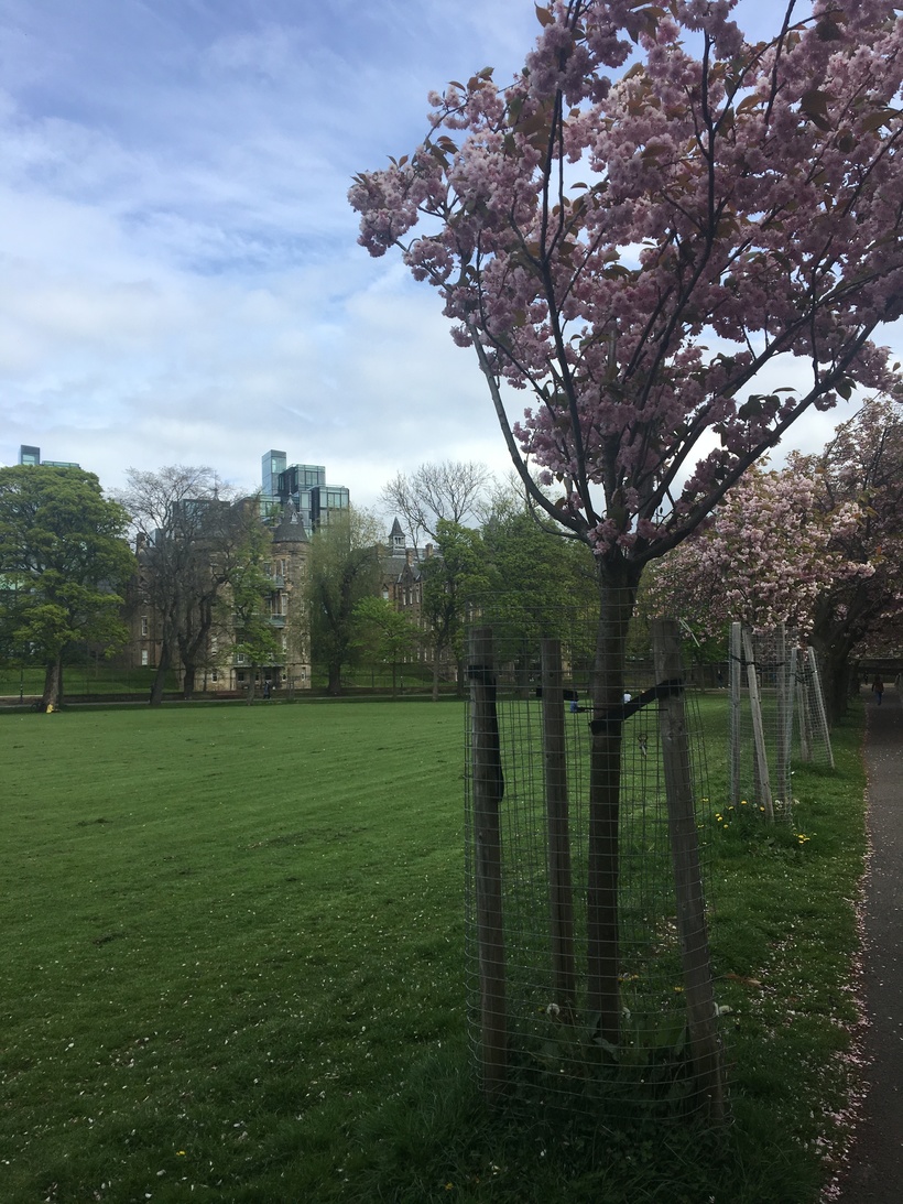 Я запланировала поездку в Великобританию на майские праздники. Первым городом, который я хотела посетить был Эдинбург. В апреле в Эдинбурге зацвела сакура и в интернете было очень много красивых фотографий из парка Медоус. Я очень надеялась, что сакура подождёт меня и не отцветёт к моему приезду. Утром 2 мая я вышла из поезда в Эдинбурге и отправилась в гостиницу, которая была расположена недалеко от вокзала. Час заселения ещё не наступил и, оставив чемодан, я отправилась гулять. Конечно, я выбрала дорогу, ведущую к парку Медоус.