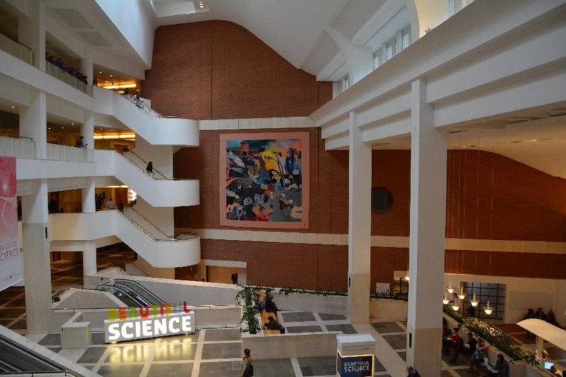 Перед зданием красиво организованная территория, с выложенной плиткой, ухоженным газоном, деревьями и статуями. Само здание библиотеки внушающих размером, а его архитектура стильная и современная.