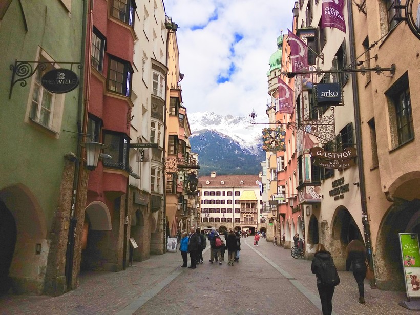 Главное занятие в старом городе Инсбрука – прогулки и любование красотами. Старые узкие улочки переплетаются между собой, и по ним очень приятно прогуливаться в любое время дня. И каждый городской пейзаж неизменно дополняют горы!
