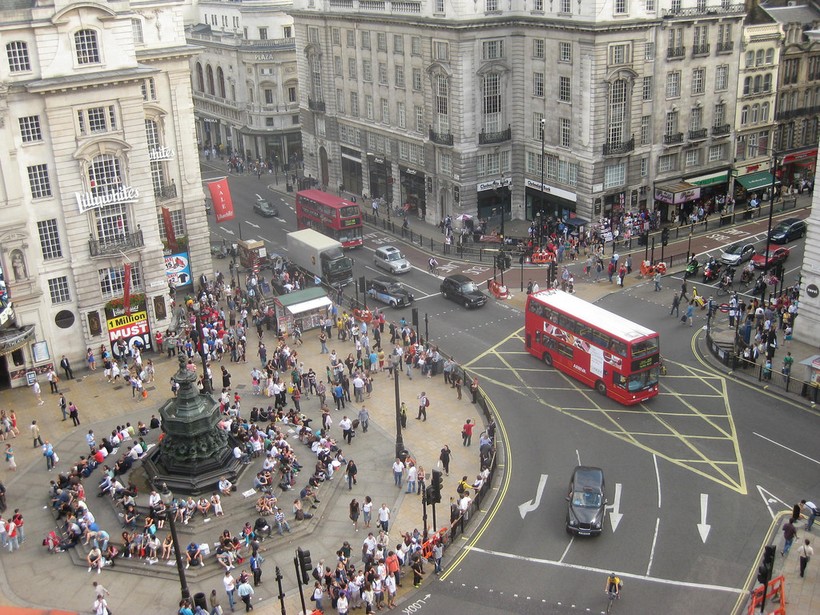Мне кажется, Пикадилли - это некая реальная картинка настоящей лондонской жизни. Здесь всегда огромное количество народу, ну, это не удивляет; причем публика очень, очень неоднородная. Кто-то живет в Лондоне и спешит по делам в одно из зданий на близлежащих улицах, спускается в метро или выходит из него; кто-то приехал из далекой страны и сейчас растерянно топчется со своим фотоаппаратом, пытаясь ухватить мгновение в бешеной, ежесекундно меняющейся атмосфере Пикадилли; кто-то неформально уселся на асфальт, прислонился к рюкзаку и читает книжку… Люди идут в магазины, назначают встречи у памятника, который уже никто не помнит, зачем тут стоит, обнимаются, хохочут, читают путеводители… Проносятся автобусы и машины, кто-то непрерывно сигналил, кто-то кого-то подрезал, и два кэба встали, а водители начали ругаться… Ни разу, даже поздним вечером, Пикадилли не бывает пустой. И всё это - под светом огромных реклам, под непрерывно сменяющимися картинками…