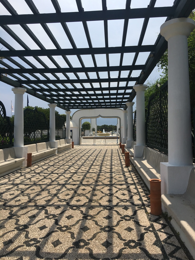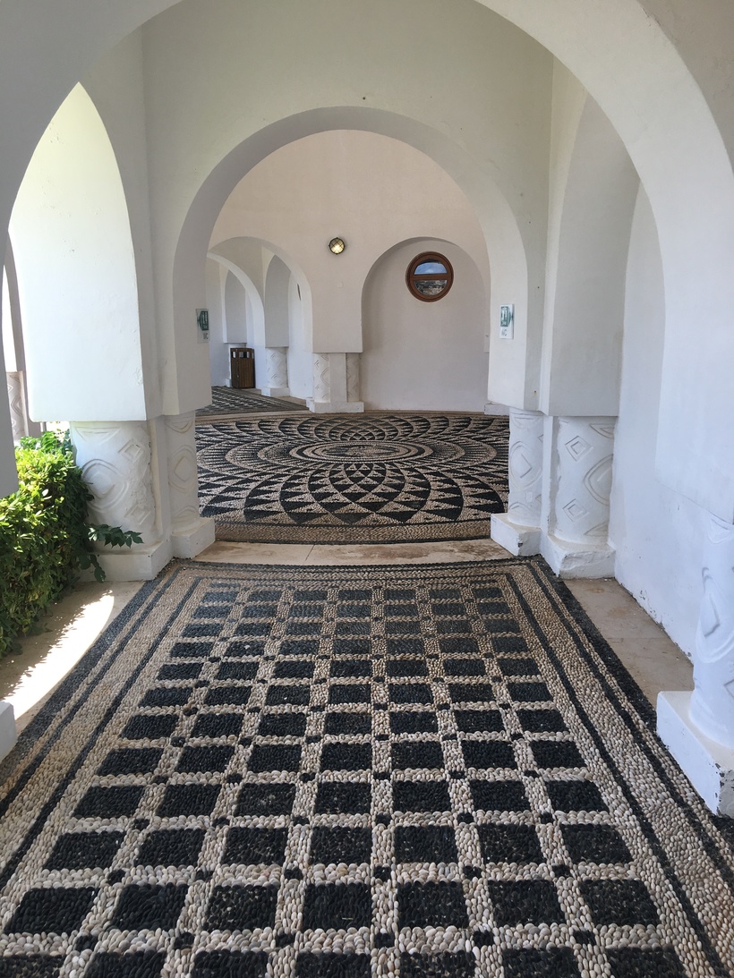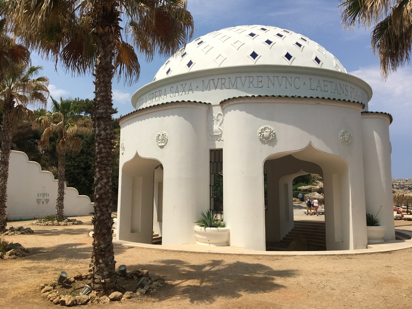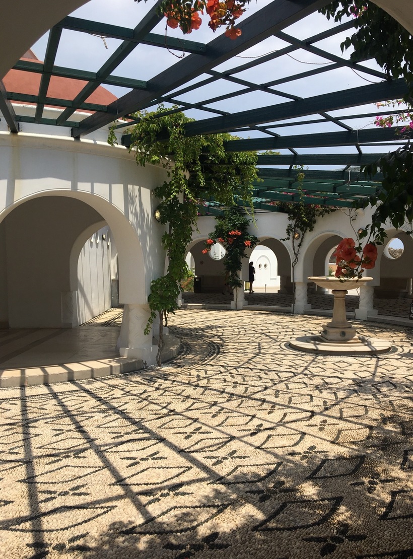 И вот мы дошли до входа в Калифея Спрингс. Рядом есть парковка, внизу – небольшой пляж и кафе. На входе – кассы, а дальше начинается красота! Белоснежный комплекс с ротондами, арками и переходами, пол, выложенный местной галечной мозаикой хохлаки (или кохлаки), то и дело открывающиеся виды на море, и очень живописный сад с цветами и травами. Очень, очень красивое место!