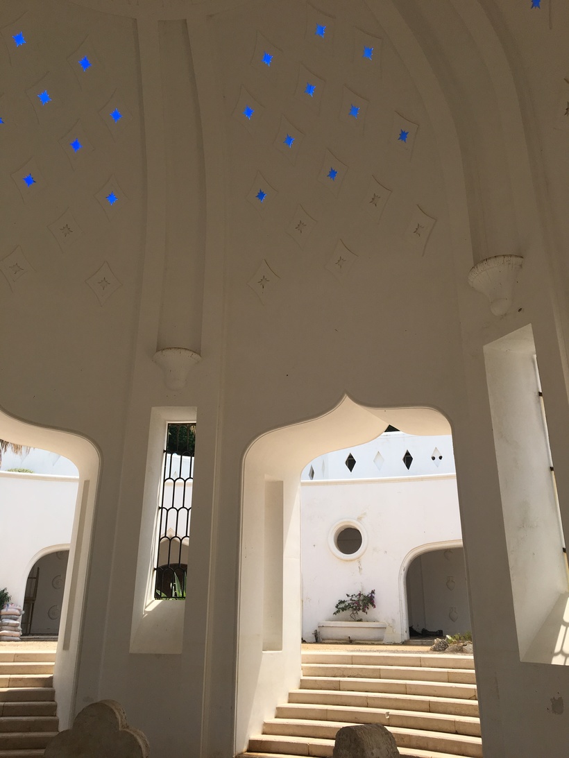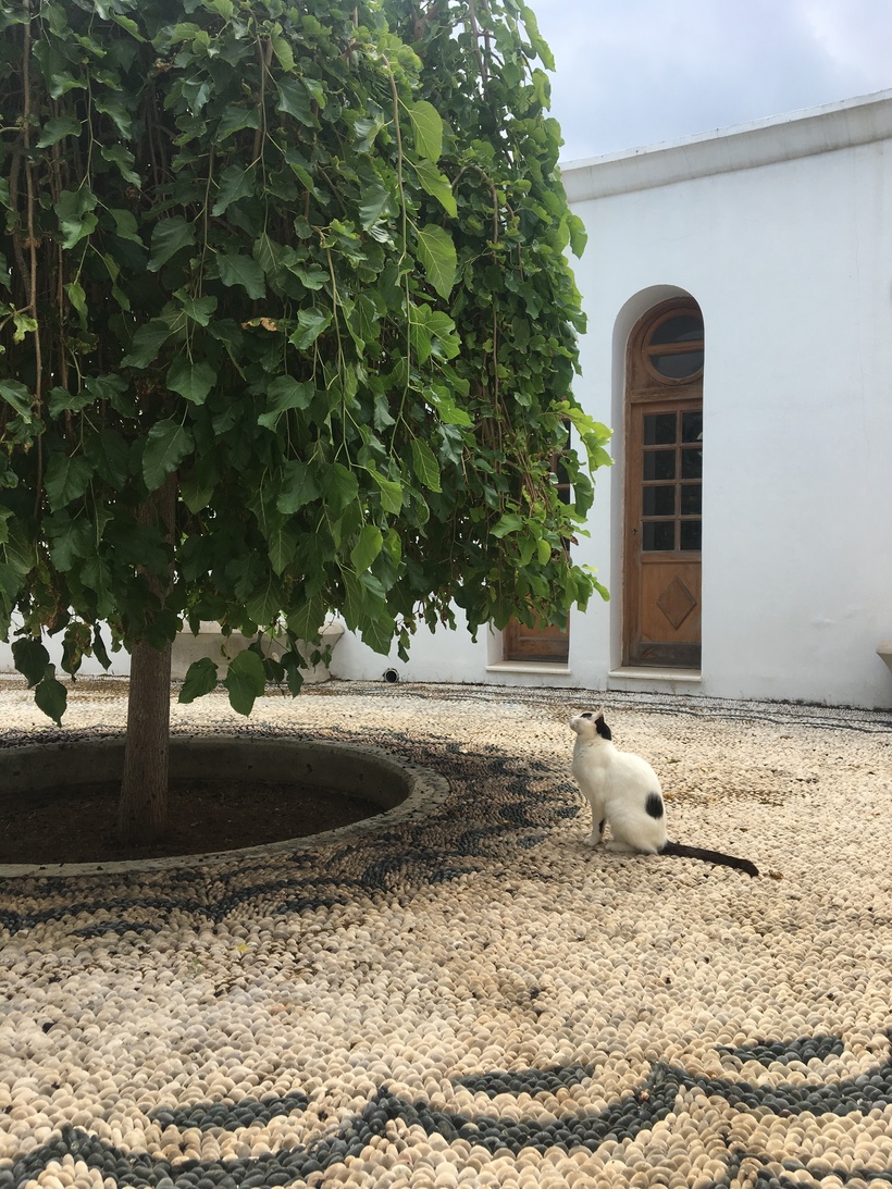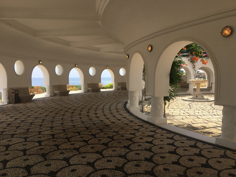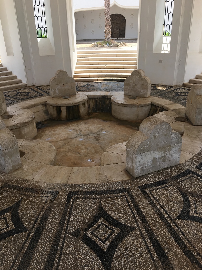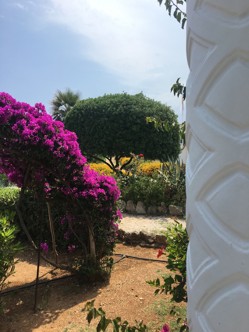 И вот мы дошли до входа в Калифея Спрингс. Рядом есть парковка, внизу – небольшой пляж и кафе. На входе – кассы, а дальше начинается красота! Белоснежный комплекс с ротондами, арками и переходами, пол, выложенный местной галечной мозаикой хохлаки (или кохлаки), то и дело открывающиеся виды на море, и очень живописный сад с цветами и травами. Очень, очень красивое место!