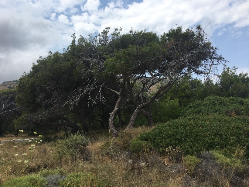Пошли и нисколько не пожалели. Сначала путь проходит мимо отелей, но как только выходишь из города, оказываешься в удивительной красоте, где со скал можно полюбоваться морем, а потом идти по прекрасной хвойной роще, где растут деревья под названием пефки, более известные многим, как пинии. Там тихо-тихо, и стоит совершенно невероятный аромат!