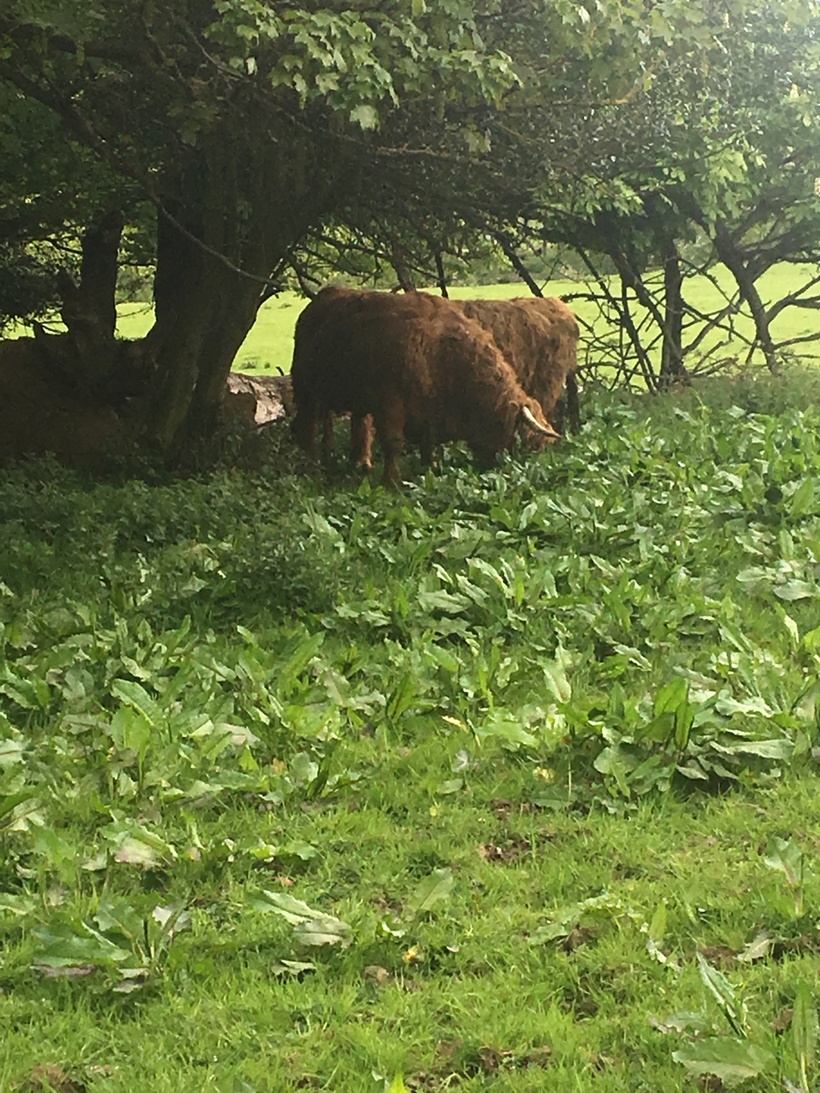 Дорога сузилась до тропинки и мне в какой-то момент стало жутковато. Я не любитель большого скопления народу, но и полное его отсутствие как-то настораживало. Тут я вспомнила, что именно в парке Поллок снимают сцены фильмов, где нужно показать первозданную природу и отсутствие людей и цивилизации. Вдруг послышались голоса и я увидела, что с правой стороны расположены поля для гольфа, где были игроки. Тут навстречу вышли две женщины с дружелюбной собакой и я расслабилась. Лес стал не такой густой, и я вышла к полю, где увидела шотландских мохнатых коров, которых мечтала посмотреть вживую, но никак не ожидала встретить здесь.