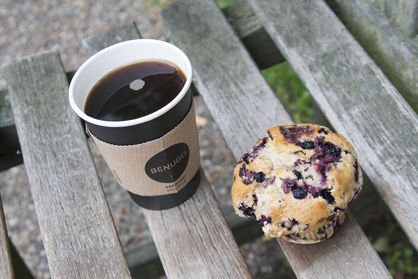 В какой-то момент я осознала, что всё, сил моих нет. Мне срочно необходимо вливание энергии в виде кофе и глюкозы. Так что я вышла к ресторанчику на берегу пруда, или, скорее, кафе, отстояла очередь в кассу и взяла себе кофе на вынос и брусничный маффин. Ух, ребята, вкусно же было! И кофе отличный, и маффин прямо объедение. Я нашла лавочку в тихом месте, устроилась на ней и кайфовала там минут сорок, наверное. Медленно пила кофе (еще долго ждала, пока остынет), жевала маффин и записывала в блокнотик впечатления.