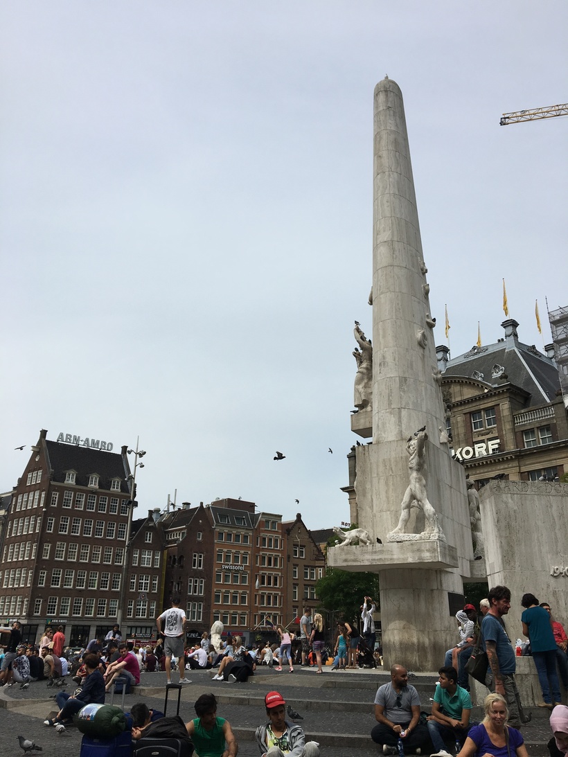 Когда я вышла на площадь, я поняла, что на улице народу было совсем не так много. Площадь Дам была просто им заполнена до краев. Почему то, я совсем не думала о такой популярности города и самой известной площади, когда планировала поездку. Заселившись в гостиницу и оставив вещи, я вернулась на площадь налегке, чтобы получше все рассмотреть. Белая колонна, стоящая на площади первой обратила на себя моё внимание. Это монумент в память о жертвах Второй Мировой войны.