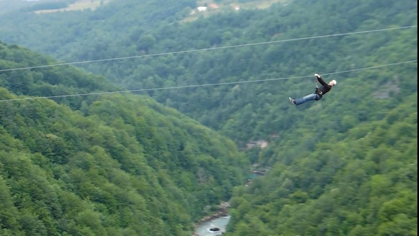 Вдоль моста прямо над каньоном реки Тара проходит маршрут тарзанки. Многие люди - экстремалы платят деньги да этот аттракцион и проходят спуск над каньоном вдоль моста за считанные секунды. Надо сказать, что орут они конечно очень впечатляюще.