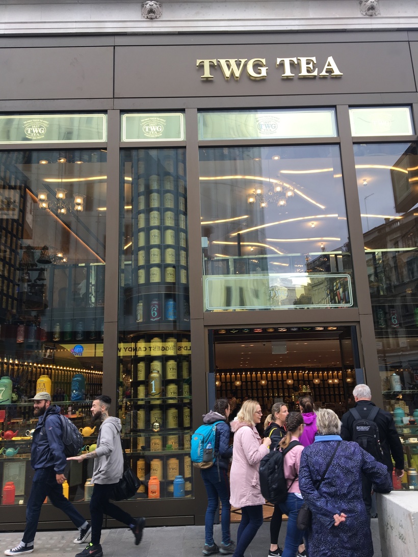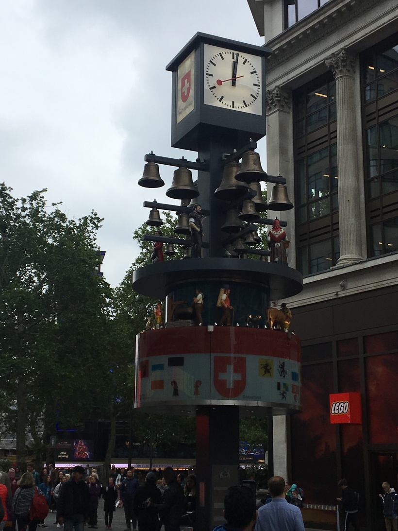 Часы были живые, фигурки двигались и масса туристов вокруг делали различные фотографии . Здесь были расположены и крупные фирменные магазины, в том числе английского чая и конфет.