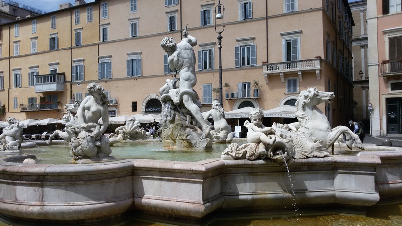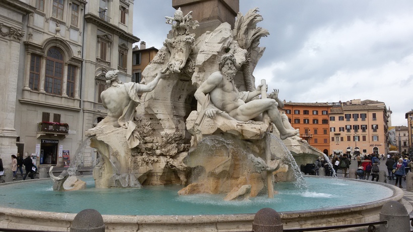 Два других фонтана на площади Навона – фонтан Мавра и фонтан Нептуна. Каждый состоит из одной главной крупной скульптуры в центре ( Мавра и Нептуна) и нескольких поменьше по краям бассейна. Это целые скульптурные композиции, мне нравилось прогуливаться вокруг них, фотографировать с разных ракурсов. Часто на эти каменные изваяния садятся вечные спутники Рима – чайки, фото с ними могут получиться более колоритными. Шум воды дополняют популярные мелодии в исполнении уличных музыкантов. Днем они любят располагаться как раз у этих двух фонтанов.