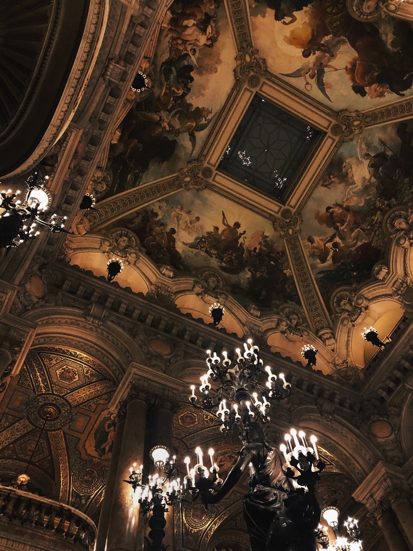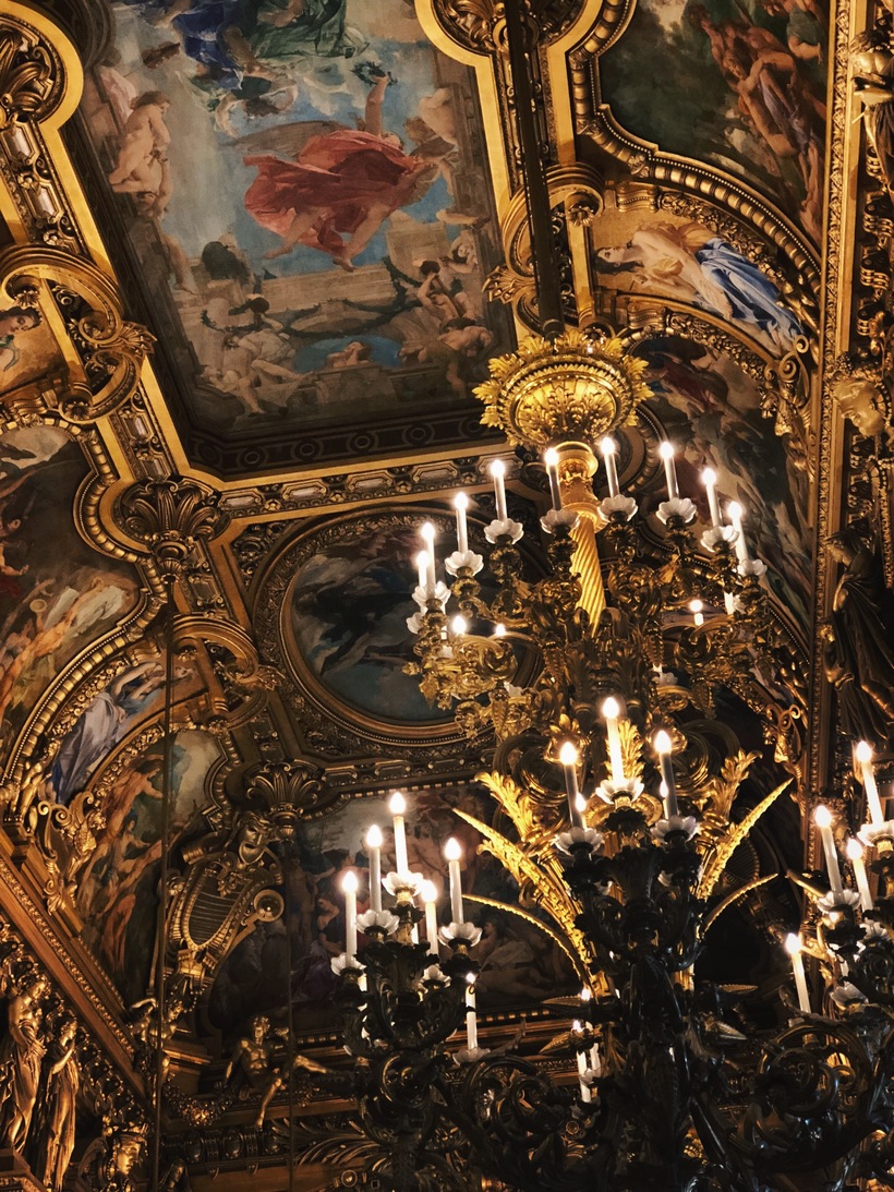 Но самое интересное находится внутри. Архитектор жаждал показать нам все богатство и роскошь Франции того века. Люстры, балконы, лестницы – всю красоту не передадут даже фотографии... А чего стоят расписные потолки! Путешествуя по дворцу нельзя не зайти в сам зрительный зал, отделанный красным бархатом. Я не смогла оторвать взгляда от «солистки» всего помещения – от великолепной огромной пятитонная люстры, расположенной на потолке, расписанном Марком Шагалом в 1964 году, где изображены сцены из известных опер и балетов.