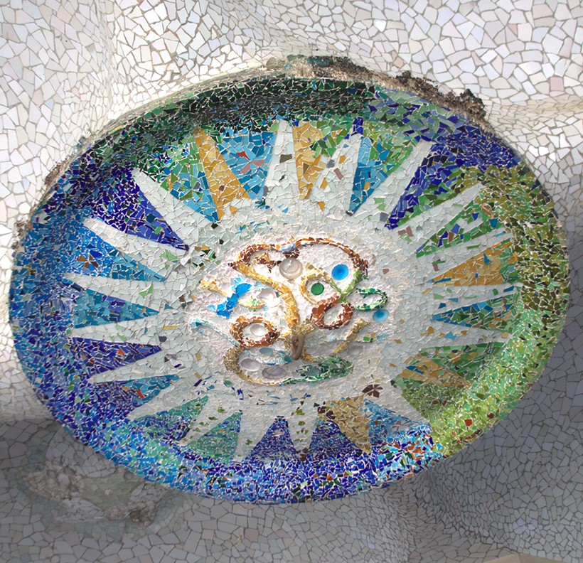 Дракон, изогнутые скамейки, солнечный медальон на темном потолке, скошенные колонны и домик Гауди – вот, пожалуй, мои любимые места в Гуэле.