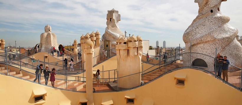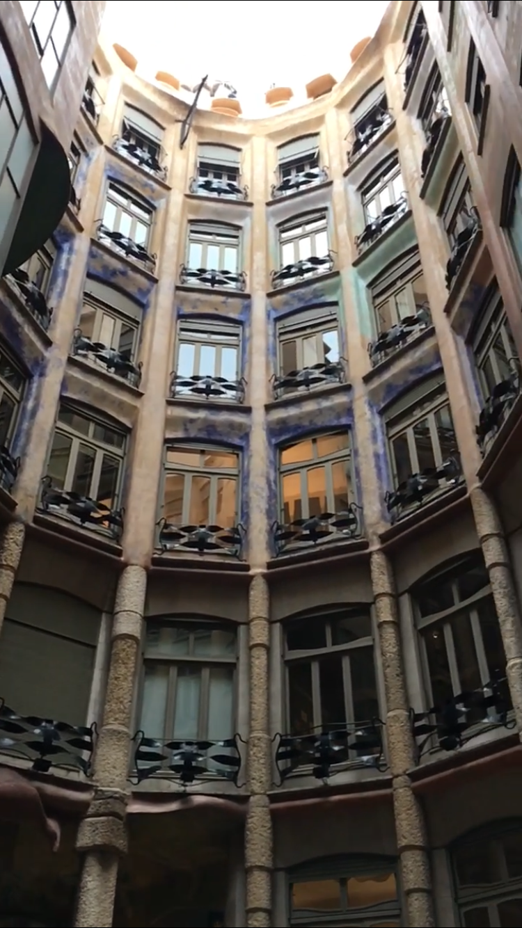 Возможно, немного придется постоять в очереди к лифту. Пока ждете, можете насладится видом на дом из внутреннего двора-колодца. Гауди продумал всё, включая естественную вентиляцию. Благодаря двум внутренним дворикам и необычному строению крыши с огромным количеством массивных и замысловатых труб, воздух свободно циркулирует внутри дома.