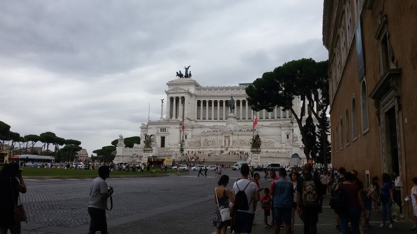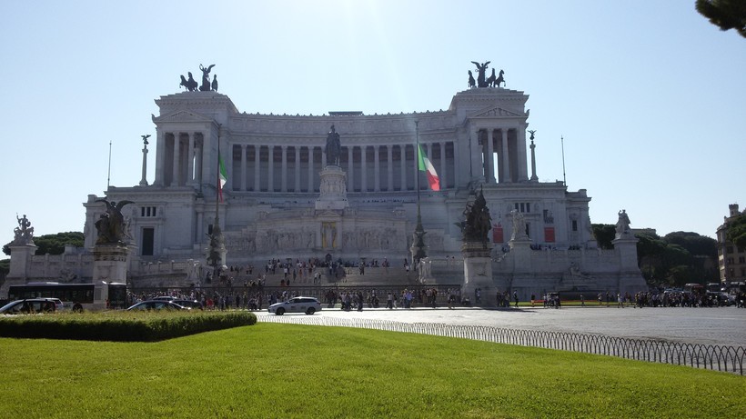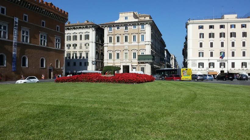 Газон разделен пешеходной дорожкой, на которой часто столпотворение туристов, фотографирующих: отсюда прекрасный вид на Монумент Витториано.