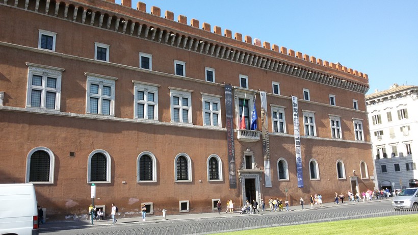 Слева находится палаццо Венеция, благодаря которому площадь так была названа. В XVI веке здесь находилось посольство Венецианской республики, когда-то заседал Муссолини…а сейчас – музей, на фасаде видны банеры,афиши выставок.