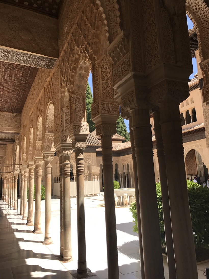 Дворец. Войти в дворец сразу не получится, так как людей запускают группами, и около входа скапливается очередь, но это не повод приходить заранее: перед входом очень солнечно и в летнее время ожидание превратится в пытку. Вообще в летнее время посещение Альгамбры может превратится в настоящее испытание: туристов много, солнце печет беспощадно. Зато внутри дворца прохладно и просто восхитительно.