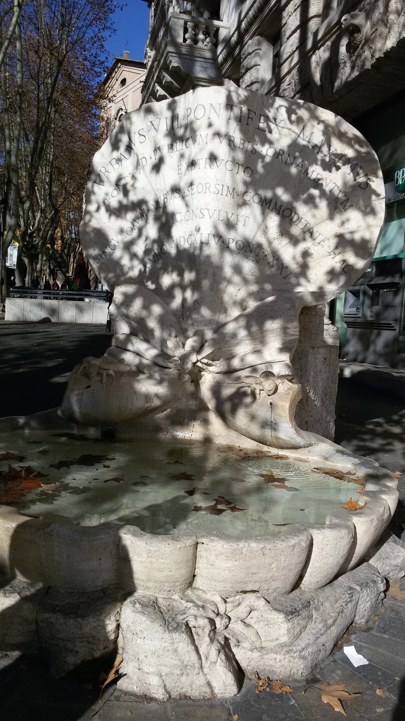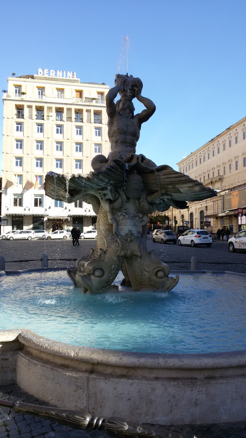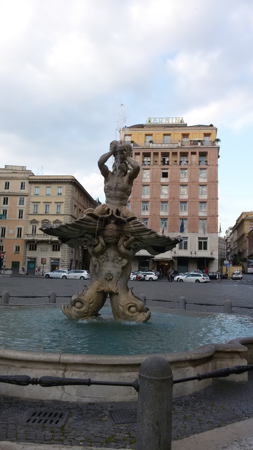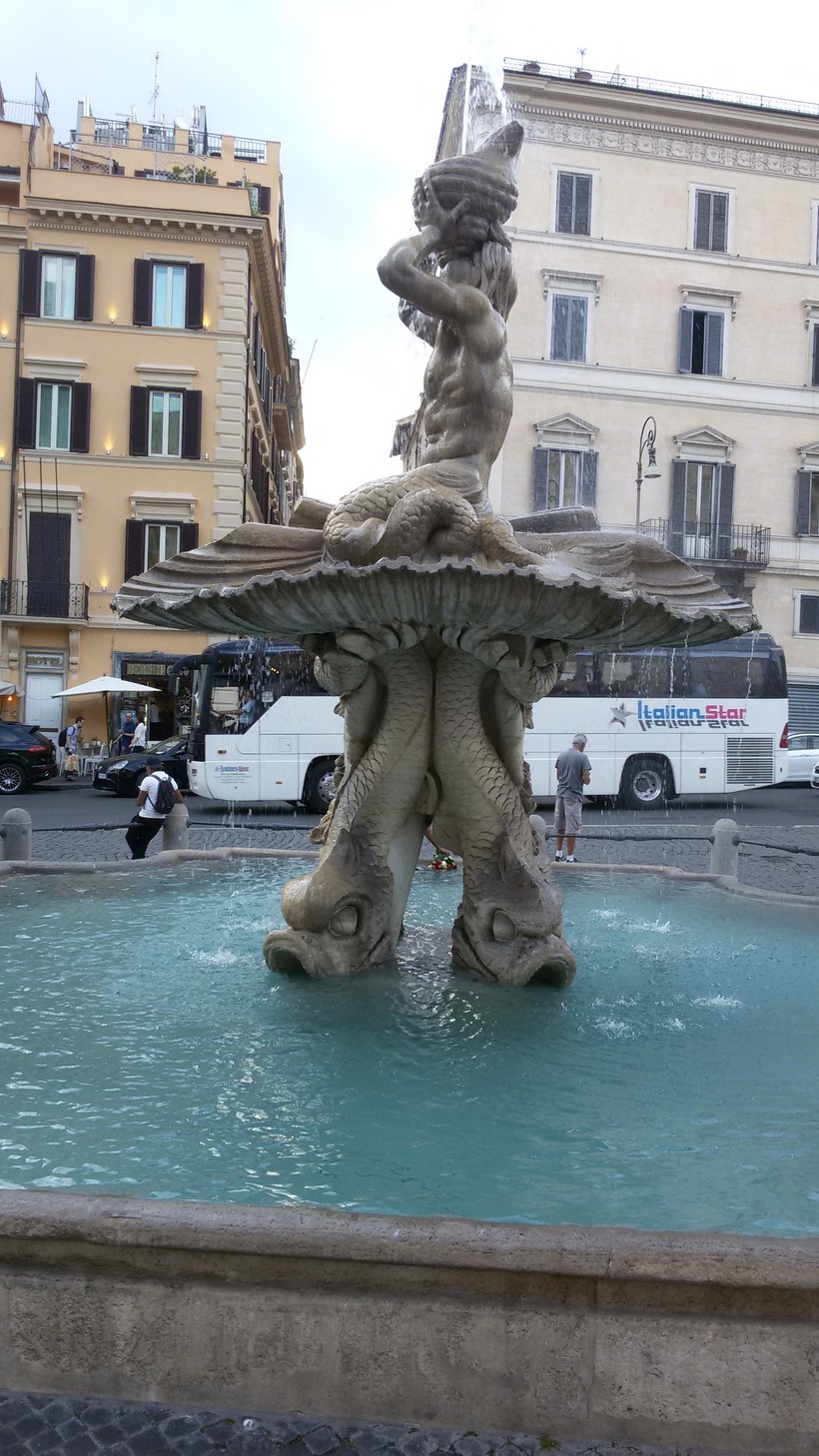 Правда, гимн этот часто дополняется звуками проезжающего мимо транспорта. Потому что площадь Барберини устроена таким образом, что фонтан, установленный в центре, окружен пешеходной зоной, а вокруг нее проезжая часть: курсируют машины и автобусы, движение достаточно оживленное. Не посидишь так спокойно, любуясь фонтаном, как, например, возле фонтанов на площади Навона.
