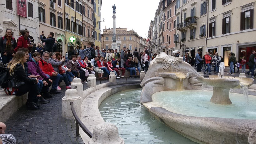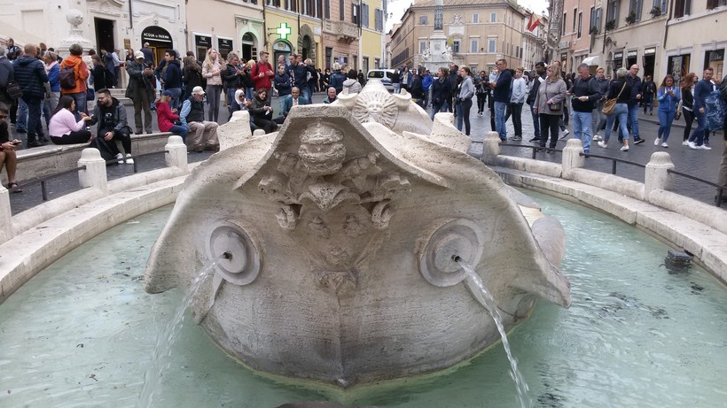 Днем трудно сделать хорошее фото Fontana della Barcaccia на фоне Испанской лестницы, со стороны улицы via dei Kondotti. Потому что именно в этом месте всегда толпится народ. Сюда постоянно подходят туристические группы, слушают короткий рассказ гида, и все массово фотографируются, стараясь занять место поближе к «лодочке». Интересно наблюдать, как туристы делают фото у фонтана, обходя его со всех сторон. Надо сказать, с любого места он «фотогеничен». Одна девушка, китаянка, сидящая рядом со мной, снимала на фоне фонтана аппетитные такие сладости в красивой дорогой коробочке, вытянув их на руке.