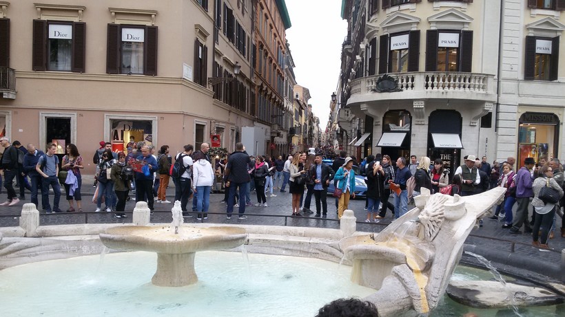 Наверное, мне повезло, особого количества туристов около фонтана я не увидела, они все на Испанскую лестницу перекочевали). И к витринам дорогих магазинов. Здесь рядом магазины марок «Dior» и «Prada». Вот правда, первый раз в жизни именно здесь в Риме видела своими глазами, что туристы не у достопримечательностей фотографируются, а у витрин магазинов. Внутрь не заходят. Уж не знаю почему. Я в магазин «Prada» зашла, мне не понравилось. Ну многие вещи красивые конечно, но обстановка напряженная. Да и цены на некоторые вещицы это отдельная тема.