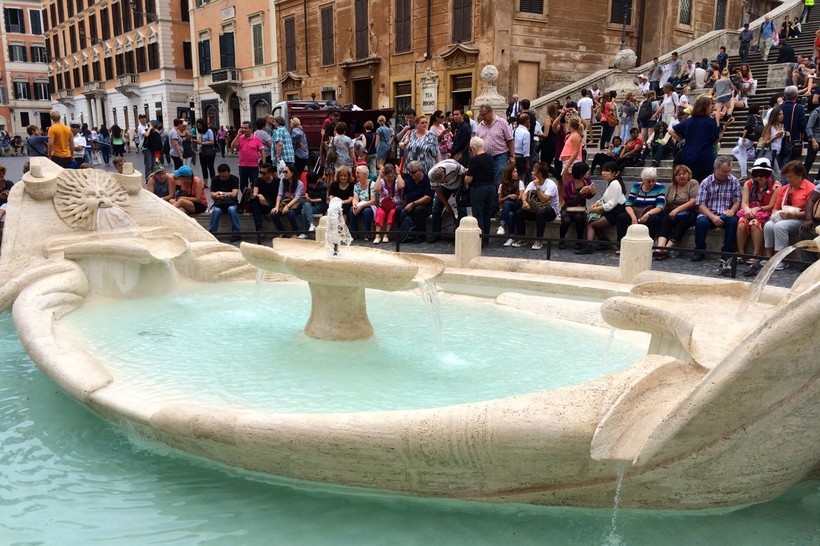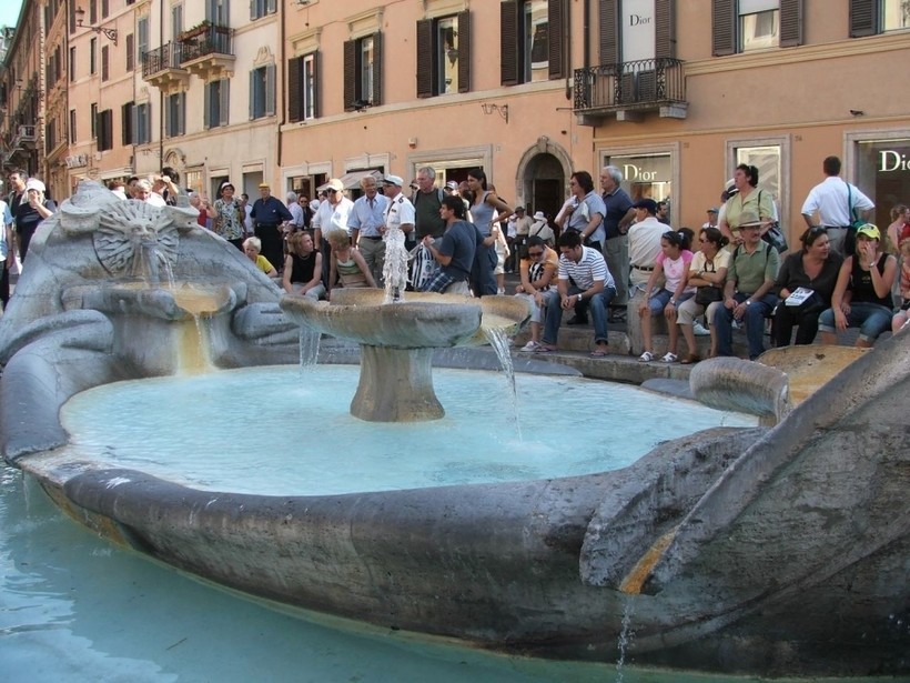 Находится фонтан на площади Испании, перед знаменитой Испанской лестницей. И хотя здесь всегда толпится много людей, мне это не мешает. Потому что можно расположиться так, чтобы фонтан никто не загораживал. Со стороны Испанской лестницы фонтан огибает такой каменный бортик-скамейка, на нем можно сидеть и смотреть… На фонтан. На туристов. На улицу via dei Kondotti, на которой находятся дорогие бутики знаменитых дизайнеров, и со стороны площади видны крупные вывески «Prada» и «Dior». Можно занять «зрительские места» и повыше – на ступенях Испанской лестницы, там виды более панорамные. Но мне нравится сидеть ближе к фонтану.