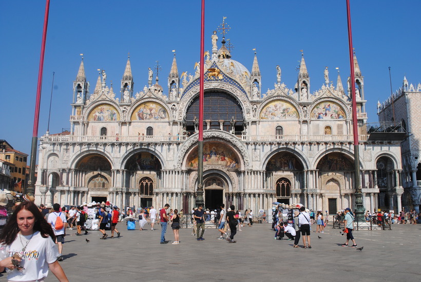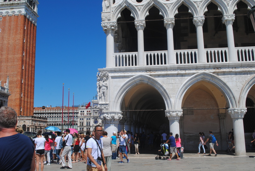 Невероятное количество людей, было просто не понятно, как площадь вмещает столько народу. Собор Святого Марка грандиозно сооружение, смотрит на площадь. Рядом шикарный дворец дожей. Яркое солнце, шикарные виды площадь запомнилась просто сказочной. Самое высокое здание, красная кирпичная башня, видна отовсюду, даже с соседних островов.