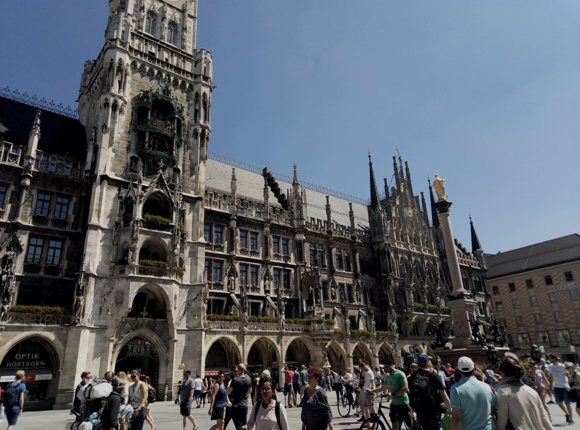Первое что я увидела, выйдя из метро в самом центре Мюнхена, была Новая ратуша. Это весьма приметное здание у северной границы площади Мариенплац трудно не заметить. По меркам европейской архитектуры ратуша построена относительно недавно – всего лишь во второй половине XIX века, но, тем не менее, она снискала большую популярность у туристов.