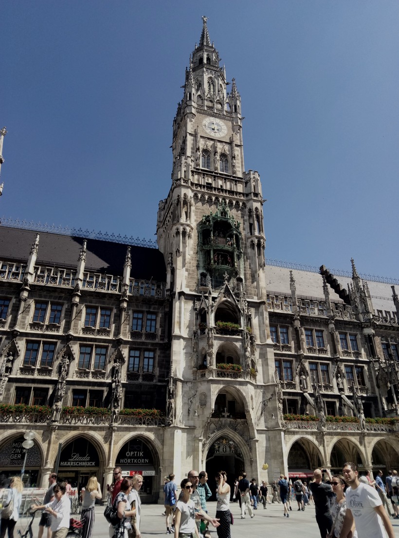 Новая ратуша, это комплекс зданий, соединенных между собой выходящим на Мариенплац, протяженным ажурным фасадом с большим количеством стилизованных под готику архитектурных и скульптурных элементов. Такая архитектура поразила меня с первого взгляда, а ранее виденные мной фотографии Ратуши из интернета не передавали ничего из того, что я воочию увидела в Мюнхене.