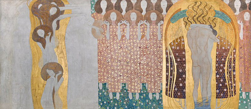 То, что мы видим в Сецессионе сейчас – это восстановленная работа, которая снова заняла свое место только в 1986 году (а создана она была в 1902 году). До этого фреска пережила непростую судьбу с разделением на части, перепродажами, захватами и т.д. Климт, конечно, очень хорош! Просто невероятно!