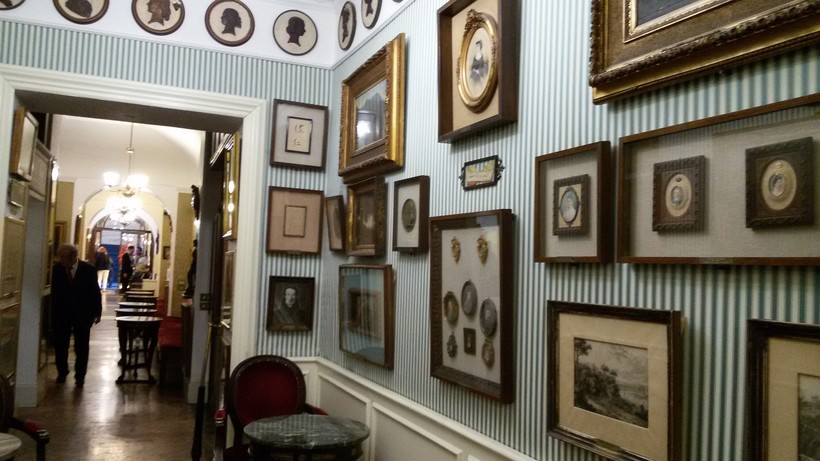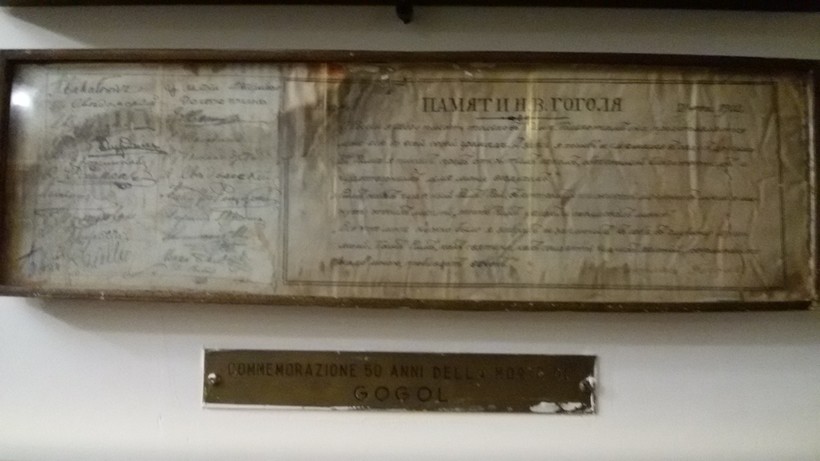 Многие туристы заходят сюда просто «поглазеть», сотрудники относятся к этому с пониманием. Один из них даже вызвался мне помочь, когда увидел, что я что-то ищу на стенах. Объяснила, что ищу связанное с русским писателем Гоголем. Мужчина показал мне вот эту надпись в рамке, с цитатой Гоголя, с множеством автографов слева и рисунком внизу.