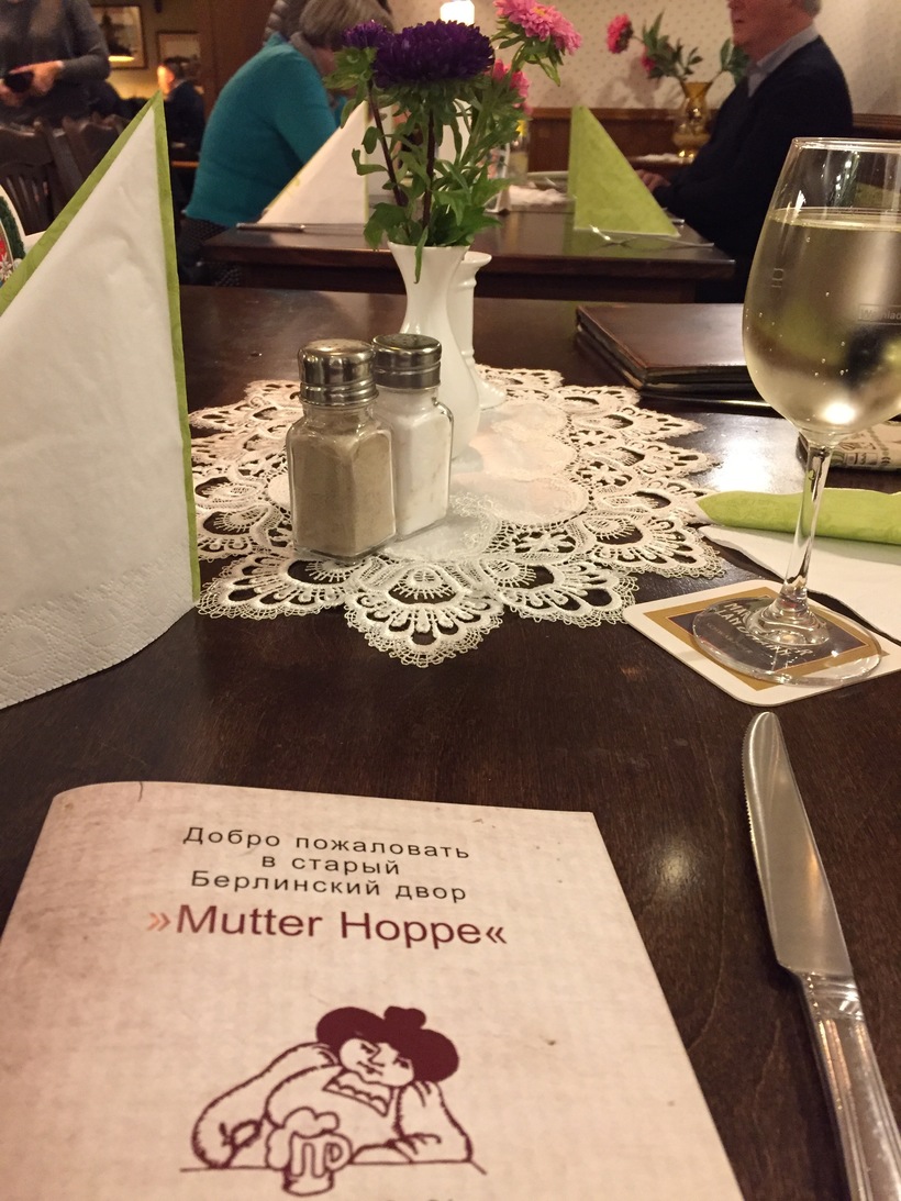 Совет: Если,гуляя по Николаевскому кварталу, вдруг проголодаетесь- зайдите в ресторанчик неподалёку, называется старый Берлинский двор «Mutter Hoppe», насколько мне известно, это было первое заведение в этом квартале. Оно очень красивое: представляет собой что-то типа очень углублённого подвальчика, и пока вы спускаетесь по красивой лестнице рядом на стене вас сопровождает некая картинная галерея, состоящая из исторических фотокарточек- очень занимательно. Пока идёте кушать, дополнительно познакомитесь с некоторыми историческим фактами (если переведёте, конечно:) ).Персонал приветливый и отзывчивый, знает несколько языков, меню разработано в вариантах на многих языках, в том числе и на русском, так что проблем с выбором точно не будет. Цены варьируются, можно подобрать блюда на разный бюджет.