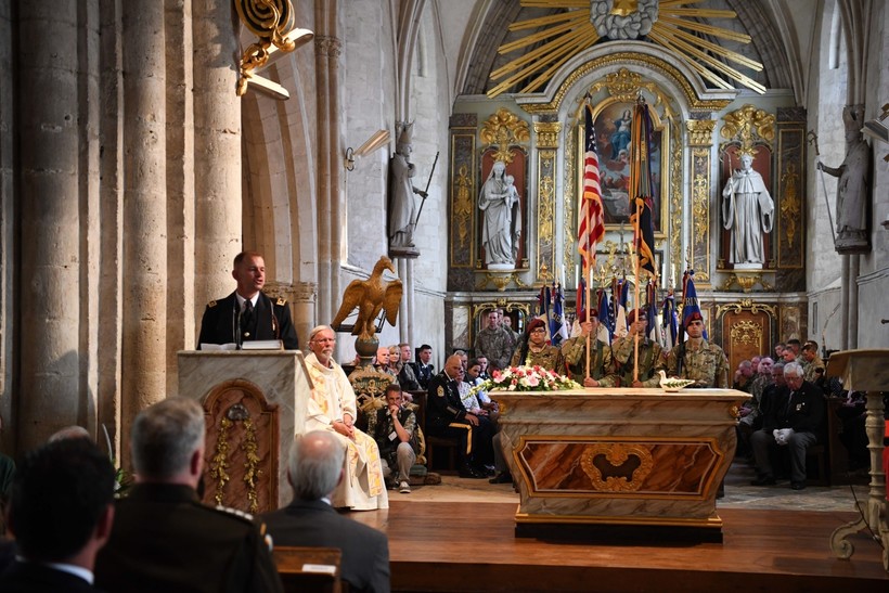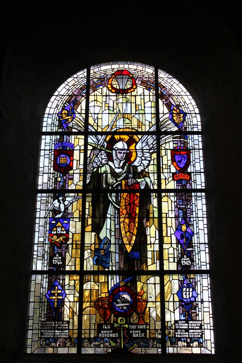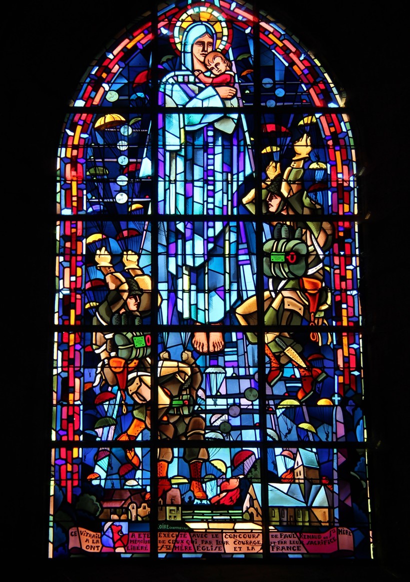 Во время этой высадки, так как очень сильно бомбили Нормандию, многие церкви (и вообще очень много архитектурных объектов) пострадали. К счастью, нормандцы строят на века, и у церквей толстые стены, но вот взрывными волнами повыбивало исторические витражи. А после того, как война окончилась и появились деньги на реставрацию, многие из витражей не стали восстанавливать в первоначальном виде.