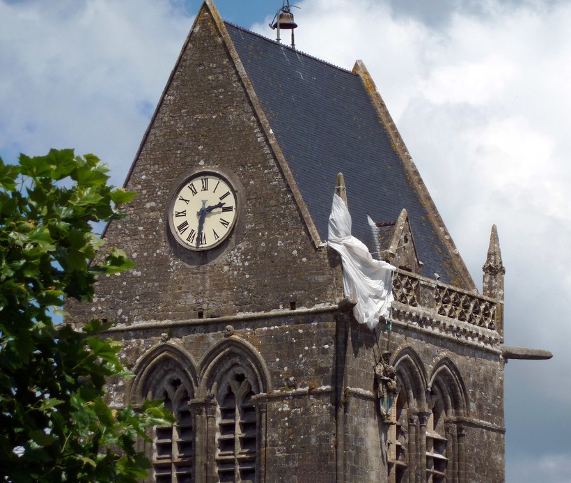 Смеяться фашистам оставалось недолго. Джон Стил был парень не промах, он умудрился сбежать (даже со сломанной ногой!) и присоединился к сопротивлению. И он прошел войну и выжил, поэтому является некоторым образом местным героем, что довольно нетипично. Местные крестьяне, конечно, американца превозносить бы не стали, но тут такая история. Вот представьте, приезжаете вы в городок Сен-Мер-Эглиз, подходите к церкви и внезапно видите, что там на крыше висит парашют. Местные жители в память об этом событии постоянно парашют там держат, и, соответственно, вы можете на него полюбоваться, заинтересоваться и эту историю совершенно логично узнать.