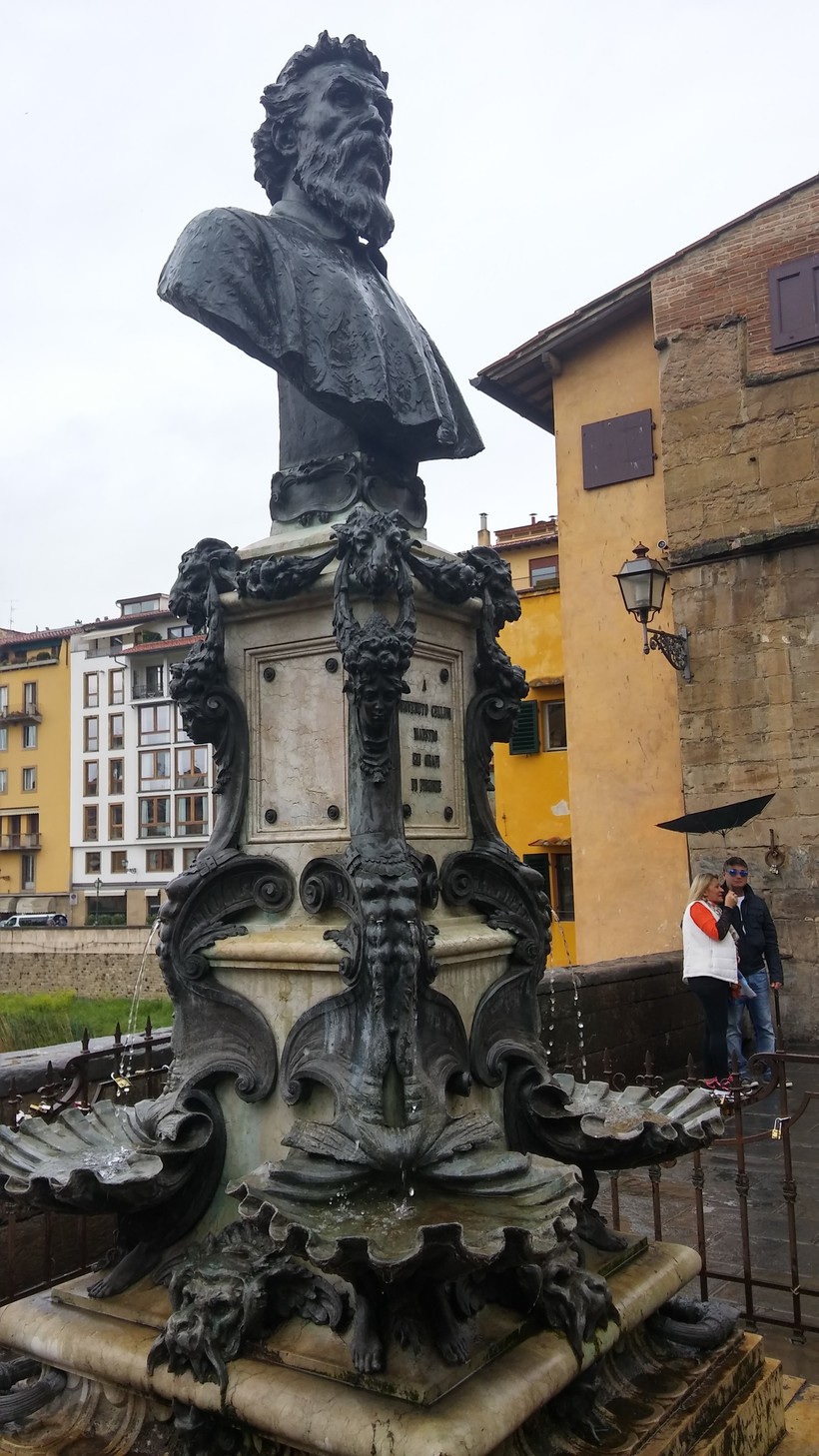 Подошла к аркам моста, с которого открывается красивый вид на реку Арно, а также сфотографировала бронзовый памятник Бенвенуто Челлини – знаменитого итальянского скульптора.