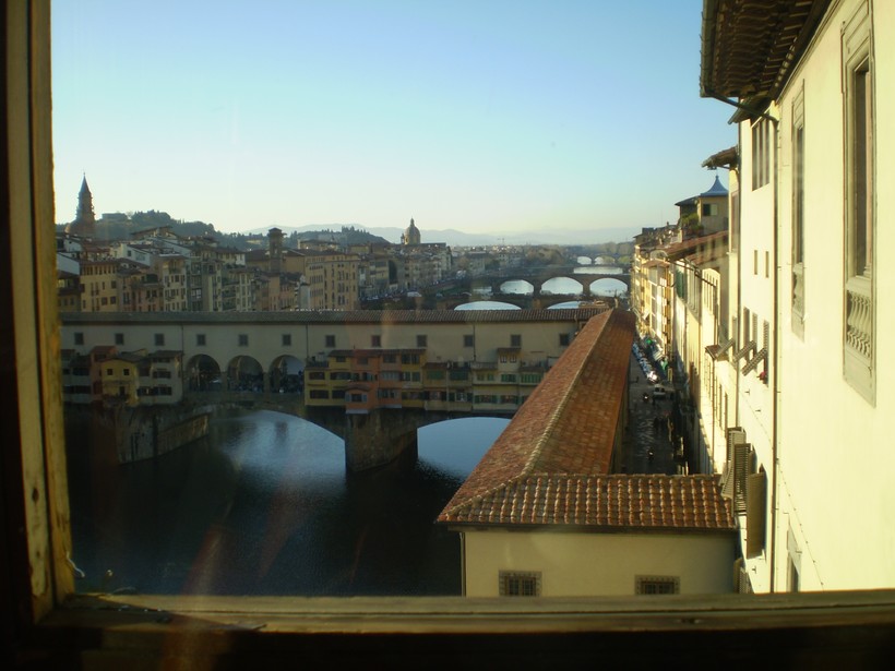 Этот коридор соединял два замка — Палаццо Питти и Палаццо Веккьо, и легенда гласит, что герцог Козимо Медичи мог подслушивать разговоры простолюдинов на мосту, стоя над торговыми рядами в коридоре над мостом.