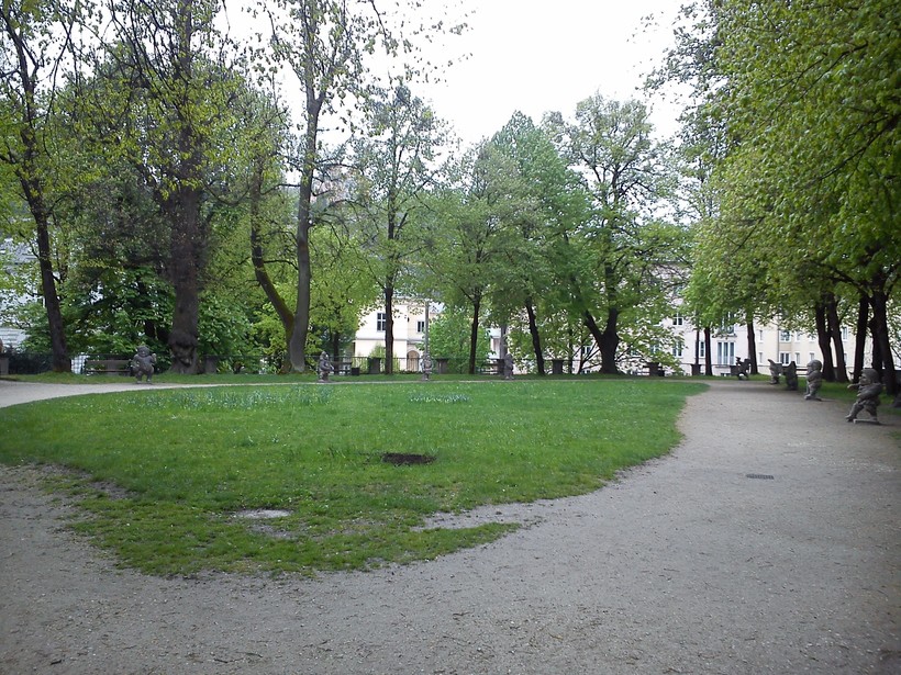 Сад относительно небольшой, очень красивый, с фонтанами и множеством скульптур. Часть скульптур, а именно фигуры гномов, отнесены на площадку в стороне.