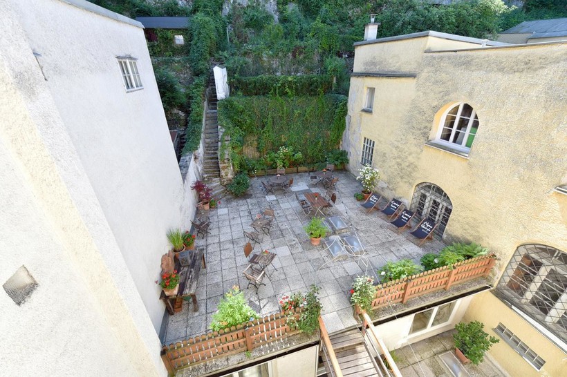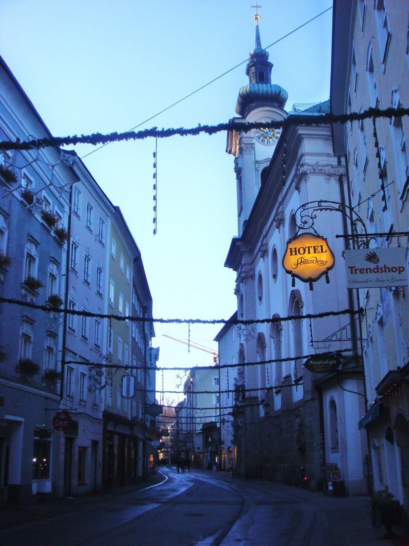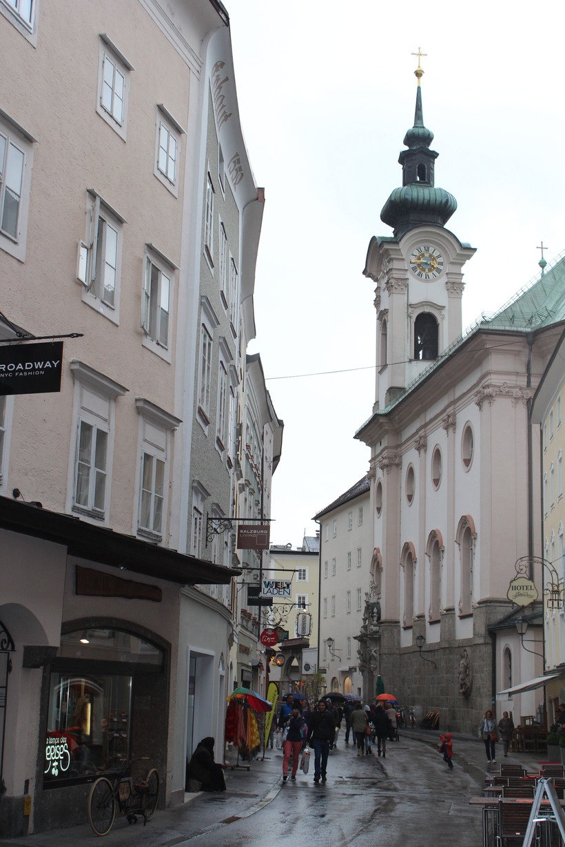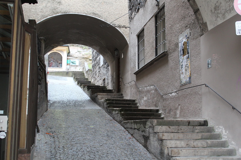 Сама улица Линцергассе по зальбуржским меркам достаточно длинная, как и на любой проходной пешеходной улице здесь множество магазинов, ресторанов и гостиниц. Но самое интересное не это, а то что здания улицы, которые расположены со стороны горы Капуцинерберг, прилегают к ней в плотную. Гостиница, в которой я останавливалась (Кроне 1512) как раз из таких зданий. Оно в несколько этажей и на некоторых, по-моему, в районе второго можно пройти гостиницу на сквозь, выйти на свежий воздух, и оказаться… (!) в горах!