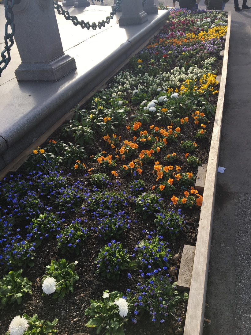 За спиной императрицы расположен вход в музейный квартал. Вокруг памятника, уже высадили цветочные клумбы.