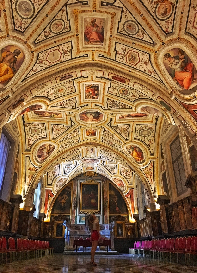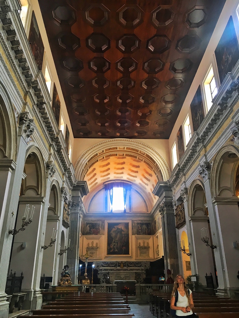 Зал Вазари - самое прекрасное, что я видела в Италии, возможно с ним поспорит только зал в Кафедральном соборе Салерно, но об этом в другой раз. И внимания стоят не только фрески на потолке, но и фигуры, вырезанные из дерева на стенах, и росписи в алтарной части...