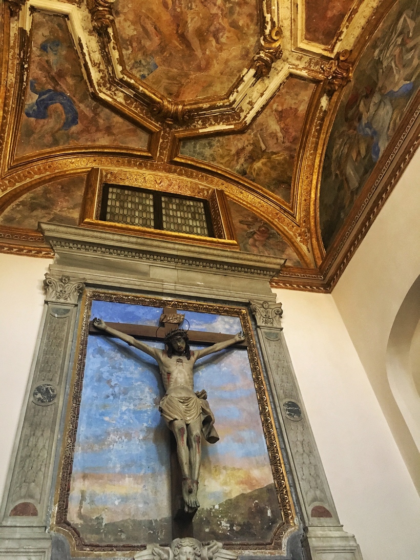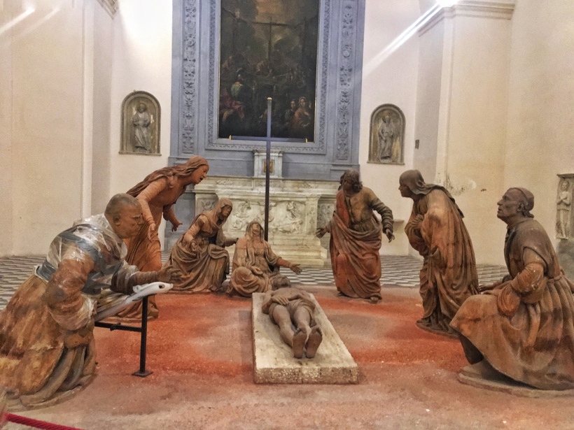 Дальше можно пройти в скромные, не до конца отреставрированные залы и увидеть терракотовую скульптуру «Оплакивание Христа», выполненную в 1942 году Гвидо Маццони.