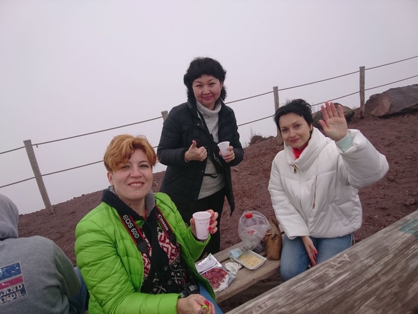 Вот и мы, удобно усевшись на лавочке у самого жерла вулкана, отпраздновали свое восхождение заранее припасенным набором гурмана )