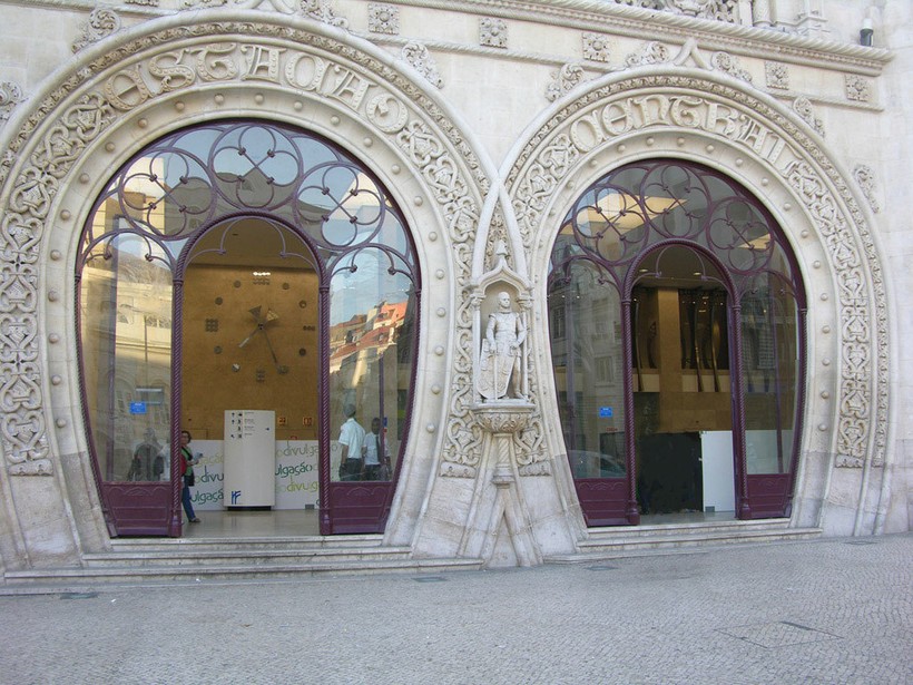 Кстати, с архитектурными стилями на данной площади полная чехарда. Обратите внимание на вокзал Росиу, вход/выход которого так напоминает подковы. Ажурные решетки, скульптурные украшения, различные переплетения – это яркий образец стиля неомануэлино. Возможно, тем, кто планирует дальнейшее путешествие по Португалии, полезно будет знать, что с данного вокзала можно доехать до Синтры.