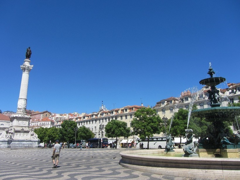 Помимо Вокзала Росиу на меня приятное впечатление произвели барочные фонтаны, установленные на площади. Помимо эстетического наслаждения они дарили и приятную прохладу в жаркий день. А ведь это немаловажно в “каменном мешке” Лиссабона. С другой раз мы уже гуляли здесь вечером – подсветка фонтанов также порадовала.